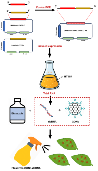 为彻底阻断目标通路,首先构建高效表达dsRNA工程菌,实现靶向PcFTZ-F1和PcCPAP3-E的融合dsRNA分子的低成本表达;进一步采用氧化石墨烯纳米片(GONs)作为载体克服dsRNA易降解、递送效率低的瓶颈,成功研制并开发柑橘全爪螨RNA干扰剂。室内生测显示了良好的控制效果。