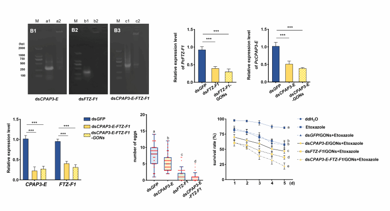 研究首先揭示并验证了全新的RNAi作用靶点——关键调控轴PcFTZ-F1 → PcCPAP3-E。其次,构建了一套从dsRNA生产到靶向递送的高效能、低成本技术体系:采用工程菌规模化、低成本表达生产dsRNA,最后由氧化石墨烯纳米颗粒(GONs)构成dsRNA递送系统。此体系与化学农药结合使用防治柑橘全爪螨,不仅增强了控制效果,还显著减少了化学农药的使用,为害虫防治的可持续管理奠定了坚实的基础。