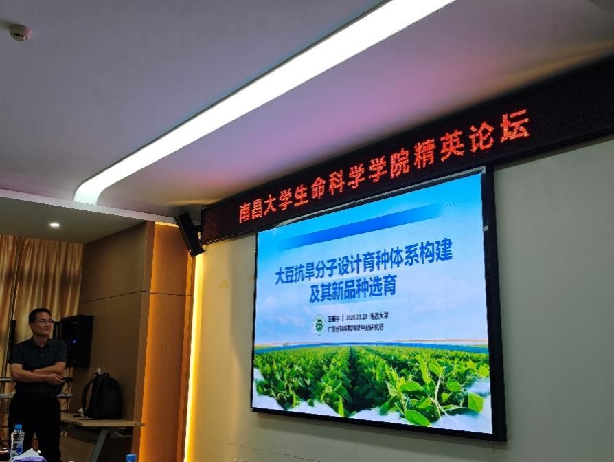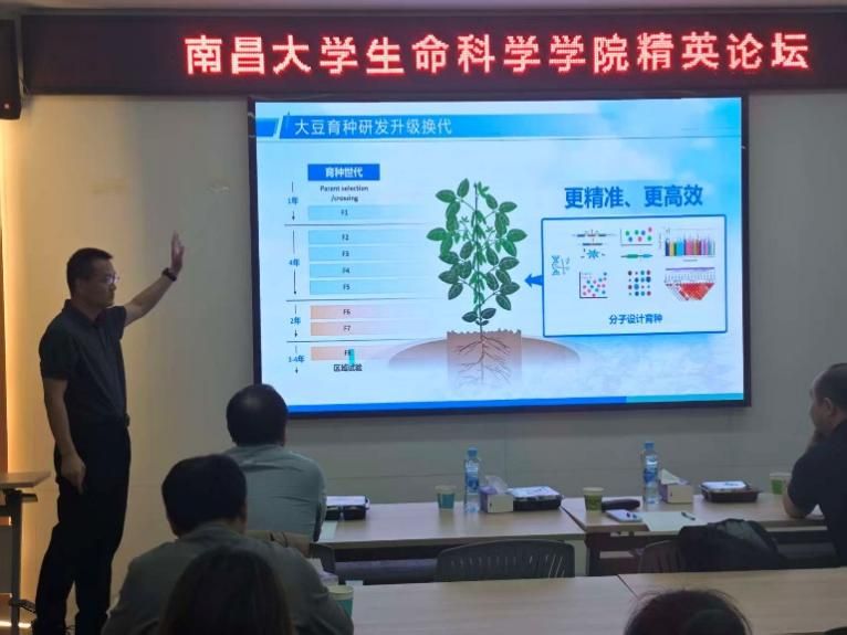 2026年3月28日15:30,南昌大学生命科学学院精英论坛(2026年第二期)在前湖校区理科生命大楼A429会议室顺利举行。本次论坛由生命科学学院副院长王东教授主持,学院相关领域教师及本硕博学生代表参会。广东省科学院南繁种业研究所王振宇研究员应邀担任主讲人,为师生作了题为“大豆抗旱分子设计育种体系构建及其新品种选育”的学术报告。