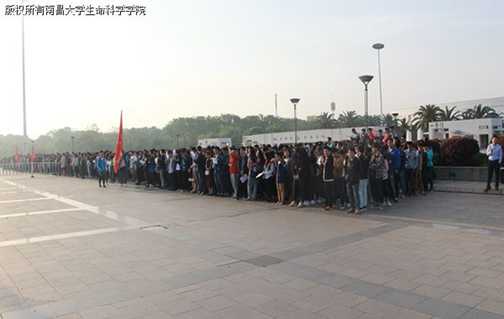 (生命科学学院学生会 记者 胡晓敏)为弘扬井冈山精神,传承红色基因,2017年4月24日早上7:00,南昌大学生命科学学院、食品学院、材料科学与工程学院和资源环境与化工学院全体同学在我校树人广场共同完成升旗仪式。生命科学学院全体学工老师和同学参加了升旗仪式。