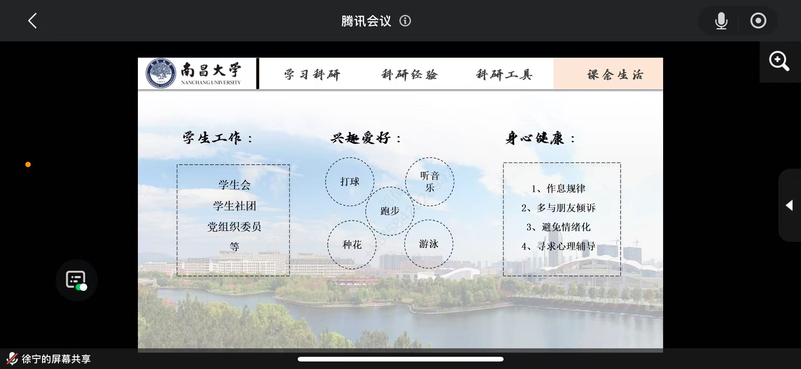 黄培荧同学以“研途不息,创梦不止”为主题展开今天的分享。首先,她向与会同学介绍了自己的基本情况。她本科就读于南昌大学水产养殖专业,期间积极参与科学研究,共获得6次科研竞赛奖项、4类奖学金和多个荣誉称号。研究生期间,她的学业成绩排名年级前5%,参与了8项专利研发、参与论文5篇,并获得研究生特等奖学金。随后,黄培荧同学将自己读研期间的经验分为了学习科研、科研经验、科研工具、课余生活、竞赛经验几个部分逐一展开了详细阐述。