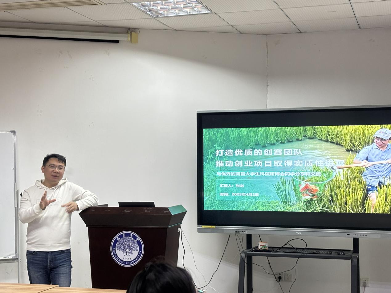 在学术与职业发展的关键阶段,研究生们既面临科研创新的挑战,也需要思考未来的就业方向。为帮助同学们提升学术能力的同时做好职业规划,南昌大学生命科学学院研究生会于4月2日晚在理生楼A731会议室举办了南昌大前湖“研”讲,南昌大学第15届“前湖研讲”研究生学术文化节·导师讲坛。本次讲座以"打造优质的创赛团队,推动创业项目取得实质性进展"为主题,邀请了南昌大学副研究员张剑老师作为主讲人,吸引了线上线下师生40余人参加。