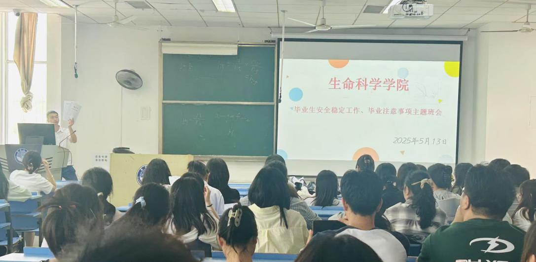2025年5月13日,南昌大学生命科学学院在理科生命大楼B101教室组织开展了2022级毕业生“安全稳定与毕业注意事项”主题班会。会议由专职辅导员罗晓通主持,研三全体学生参加。此次班会旨在帮助研三毕业生顺利完成学业,保障毕业阶段的安全稳定。