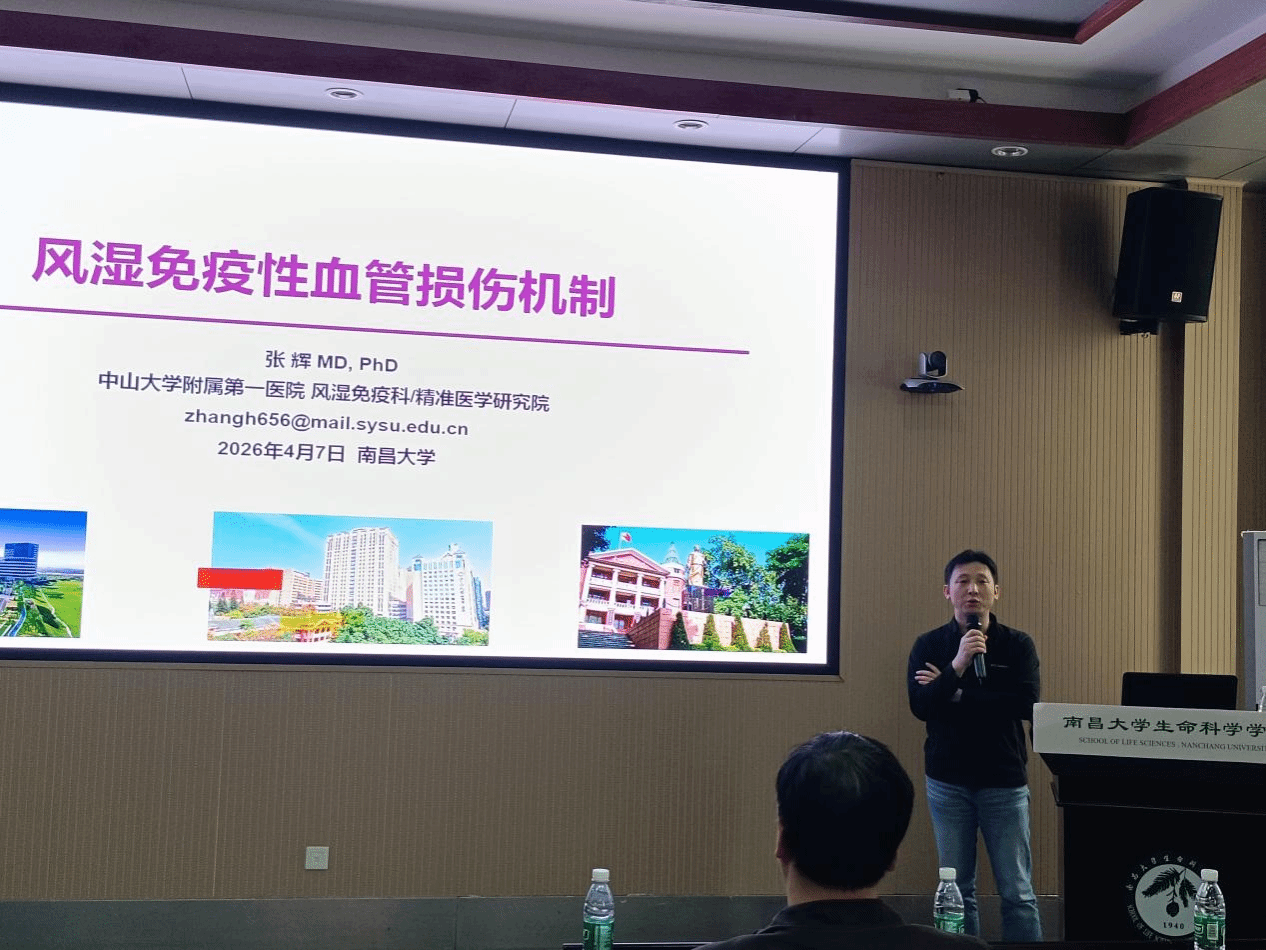 At 14:30 on April 7, 2026, the "Academic Activity Month" commemorating the 105th anniversary of Nanchang University, held in conjunction with the fourth session of the 2026 Elite Forum of the School of Life Sciences, convened in Room A102A of the Foundation Experimental Building at the Qianhu Campus. The forum was hosted by Professor Xiaoli Tian, Director of the Institute of Human Aging, School of Life Sciences. The keynote address was delivered by Researcher Hui Zhang, Deputy Director of the Department of Rheumatology and Immunology at the First Affiliated Hospital of Sun Yat-sen University and Head of a research group at the Institute of Precision Medicine. His report, titled "Mechanisms of Immune-Mediated Vascular Injury in Rheumatic Diseases," was presented to the school's faculty and students.